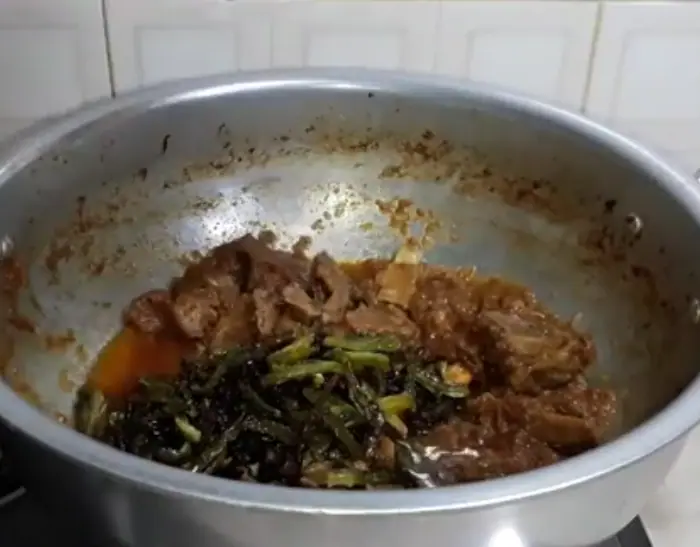 1. Now add fried caralluma tuberculata to the meat curry. Stir well to ensure the flavors are evenly distributed.