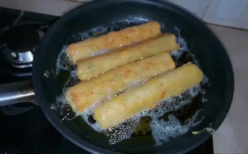 Prepare all the rolls in the same way. You’ll have almost 8 rolls. Next, fry these chicken-vegetables stuffed rolls. Try to fry these rolls immediately after rolling.