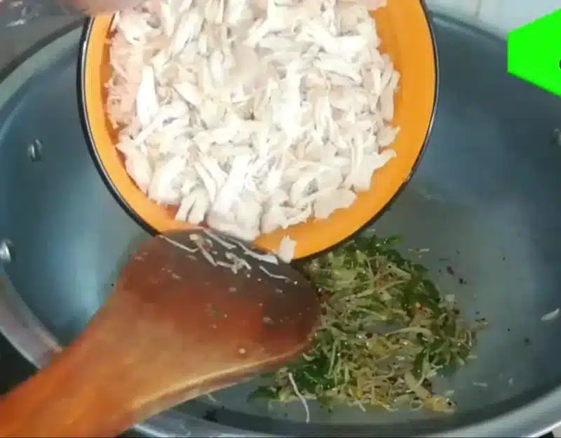- Add shredded chicken. Add finely chopped fresh green chilis and fresh coriander. Sauté for 2-3 minutes.