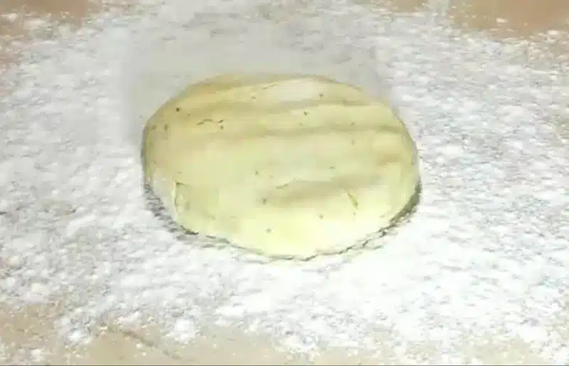 - After 30 minutes of dough resting, prepare roll sheets. Dust the surface with all-purpose flour, place the dough ball on it, and press to flatten. Dust the other side, too.