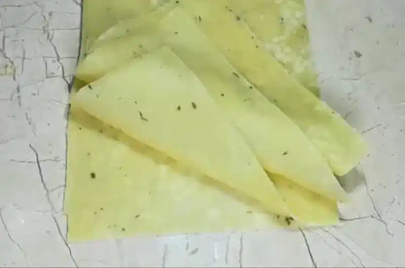 Next, place tawa on the stove and cook the arranged sheets bundle for 30 seconds from both sides. Now trim the edges of this oval-shaped bread to get rectangular-shaped sheets.
